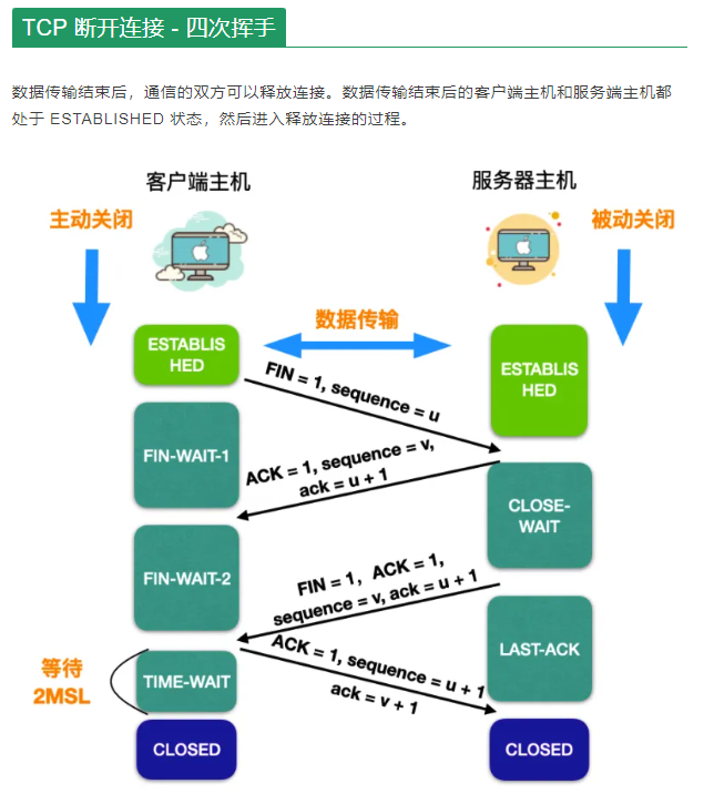 服务端主要收到了客户端的断开连接确认后,就会进入 CLOSED 状态。因为服务端结束 TCP 连接时间要比客户端早,而整个连接断开过程需要发送四个报文段,因此释放连接的过程也被称为四次挥手。