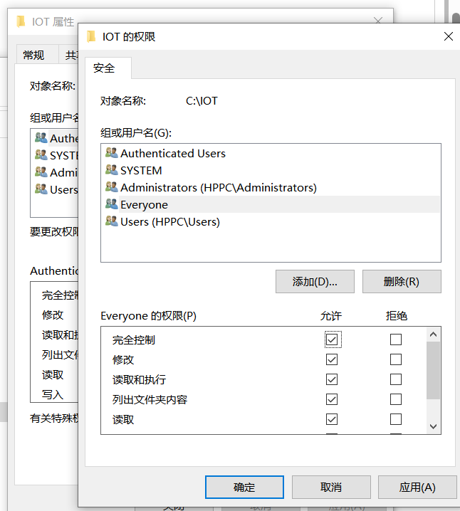 在服务器电脑的C盘创建IOT文件夹,赋予Everyone所有者完全控制权限,将配置截图,另存为D-4-1.jpg。