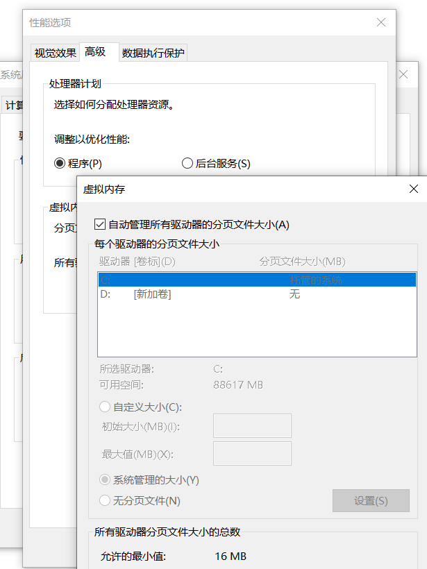 将系统的虚拟内存设置为自动管理所有驱动器的分页文件大小的配置界面截图,另存为D-4-2.jpg。