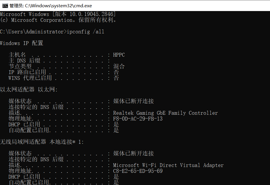 在控制台使用命令查看Ip地址和物理地址映射,将命令和执行后的结果截图,另存为D-4-6.jpg