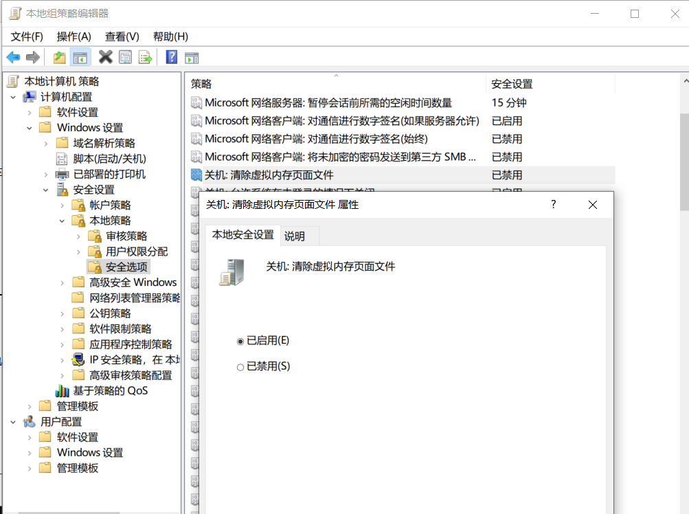 启用关机清除虚拟内存页面文件,将配置界面截图,另存为D-4-4.jpg。