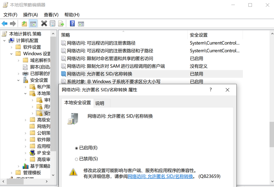 启用允许匿名SID/名称转换,将配置界面截图,另存为D-4-5。jpg。