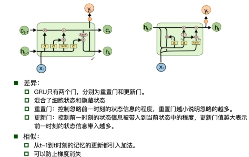 控制单元状态 c_t 有多少输出到 LSTM 的当前输出值 h_t - GRU