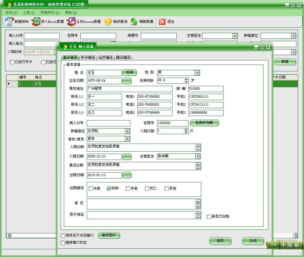 是一款针对病人基本情况、手术情况、化疗情况、随访情况的存储、修改维护、条件查询、导出导出Excel、科室数据合并、图片查找、数据打印、高级查询等功能的软件,另外软件支持用户登录、密码修改、分页显示等功能,软件界面大方美观,非常适合做病人资料的管理维护,已经成功运行在多家大型医院科室的管理中,软件具有良好的稳定性和友好性。