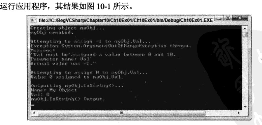 public class MyClass { public readonly string Name; private int intVal; public int Val { get{return intVal;} set { if(value >= 0 && value <= 10) myInt=value; } } public override string ToString() { return "Name:" + Name + "\nVal:"+Val;} private MyClass():this("Default Name") {} public MyClass(string newName) { Name=newName;intVal=0;} } //调用: static void Main(string[] args) { Console.WriteLine("Creating object myObj..."); MyClass myObj=new MyClass("My object"); Console.WriteLine("myObj created."); for(int i=-1;i<=0;i++) { try{ Console.WriteLine("\nAttempting to assign {0} to myObj.Val..."); myObj.Val=i; Console.WriteLine("Value {0} assigned to myObj.Val.",myObj.Val); } catch(Exception e) { Console.WriteLine("Exception {0} thrown.",e.GetType().FullName); Console.WriteLine("Message:\n\"{0}\"",e.Message); } } Console.WriteLine("\nOutputting myObj.ToString()..."); Console.WriteLine(myObj.ToString()); Console.WriteLine("myObj.ToString() output."); Console.ReadKey(); } }
