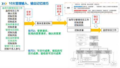 (5)实施整体变更控制:审查所有变更请求,批准变更,管理对可交付成果、组织过程资产、项目文件和项目管理计划的变更,并对变更处理结果进行沟通的过程。主要作用是,从整合的角度考虑记录在案的项目变更,从而降低因未考虑变更对整个项目目标或计划的影响而产生的项目风险