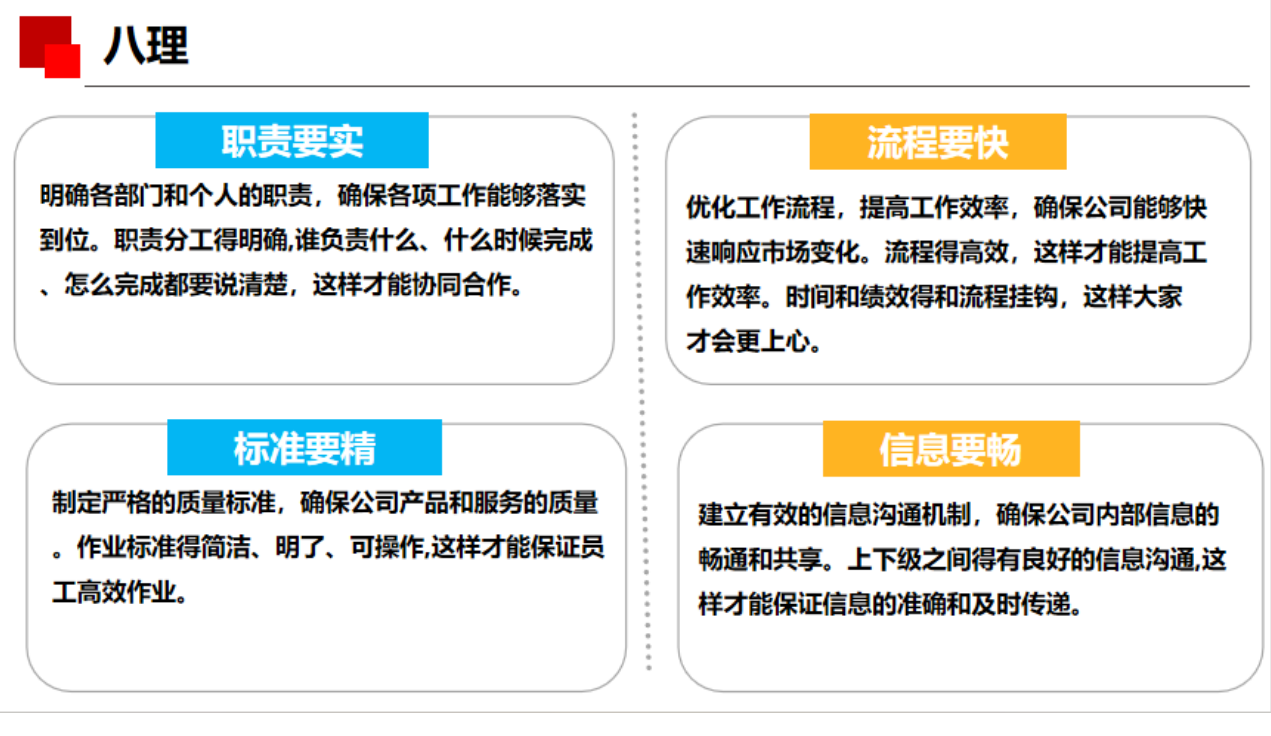 管理是什么?很多人理解管理就是管人和理事,科学管理之父泰罗认为,管理就是确切的知道你要别人干什么并使他用最好的方法去干。对于一个企业来说,管理到底应该管理什么呢?最重要的就是四管和八理。