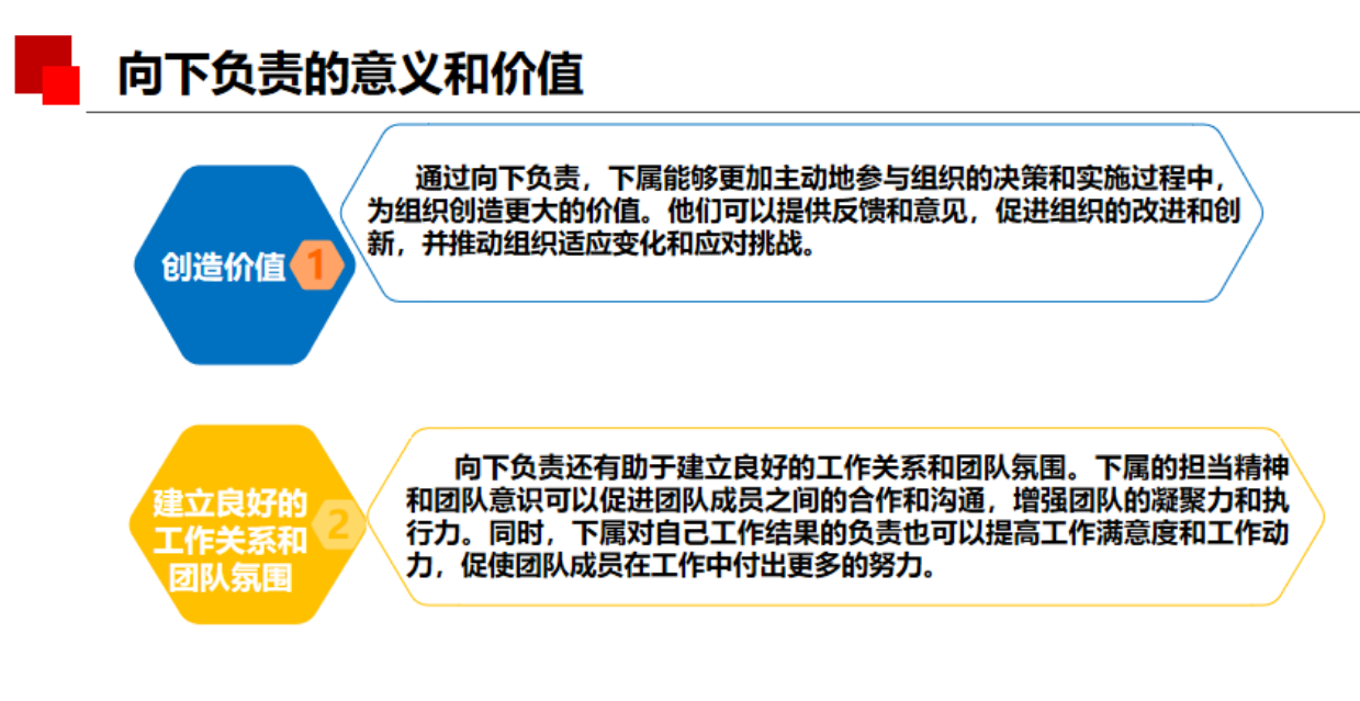 定义:向下负责是指下属在组织中承担责任和义务,并对自己的工作和决策负责。向下负责不仅仅是履行职责,还体现了下属对组织、团队和自己的责任感和担当。