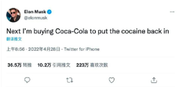 就在马斯克公开表态收购推特后没多久,4 月 28 日,特斯拉 CEO 埃隆 · 马斯克发推表示,接下来,将收购可口可乐,然后 " 把可卡因加回饮料配方中去 "。