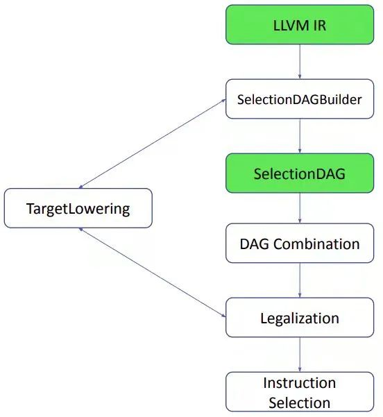 为了解决这个问题,TargetLowering 类中的算法会在这里被首次使用。不同目标的 backend 要实现 TargetLowering 抽象接口。只有一小部分节点会在这里转成目标相关节点,大部分节点都在 Instruction Selection 中在 pattern match 后被替换成机器指令。