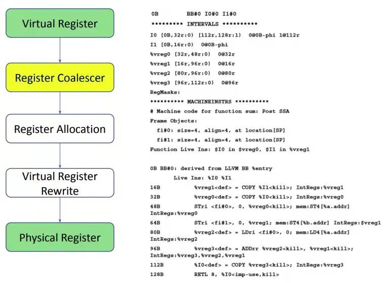 在 coalescing 之前会运行活动变量(live variable)分析 pass,因此实例代码中会有活动变量信息,显示每个寄存器在哪个时刻被定义和销毁。INTERVALS 之后的信息就是活动变量分析结果,MACHINEINSTRS 之后的信息是机器指令。活动变量信息对分析寄存器的相互影响很有用,如果在同一时间有几个虚拟寄存器存活,就需要分配不同的物理寄存器。