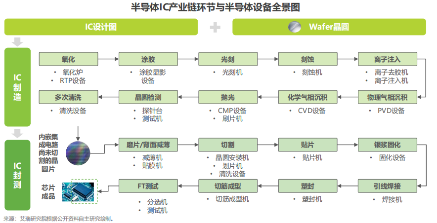 以IC设计图与晶圆为基础,产品进入IC制造环节,包括氧化、涂胶、光刻等一系列步骤,在各步骤中对应相应半导体制造设备;同样,在IC制造环节后,内嵌集成电路尚未切割的晶圆片会进入IC封测环节,包括磨片、切割、贴片等一系列步骤,在各步骤中也同样对应相应半导体封装设备与半导体测试设备,最终得到芯片成品,总体半导体设备全景图如下所示。