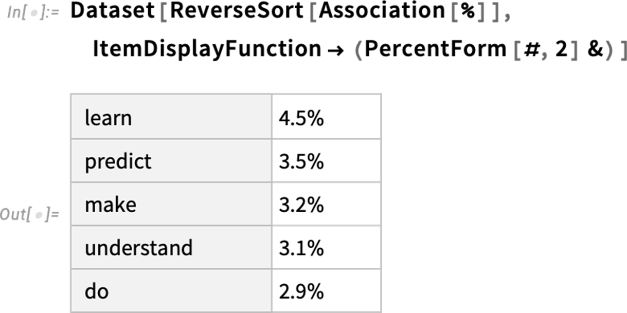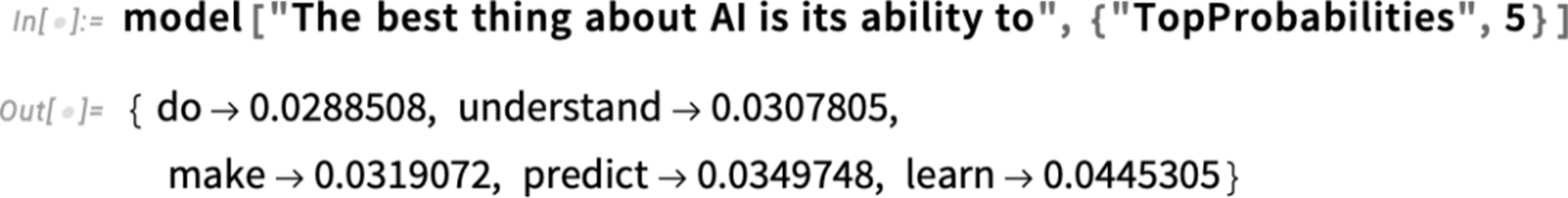 稍后,我们将看看这个神经网的内部,并谈谈它是如何工作的。但现在我们可以把这个 “网络模型” 作为一个黑匣子应用于我们迄今为止的文本,并要求按概率计算出该模型认为应该选择的前五个词: