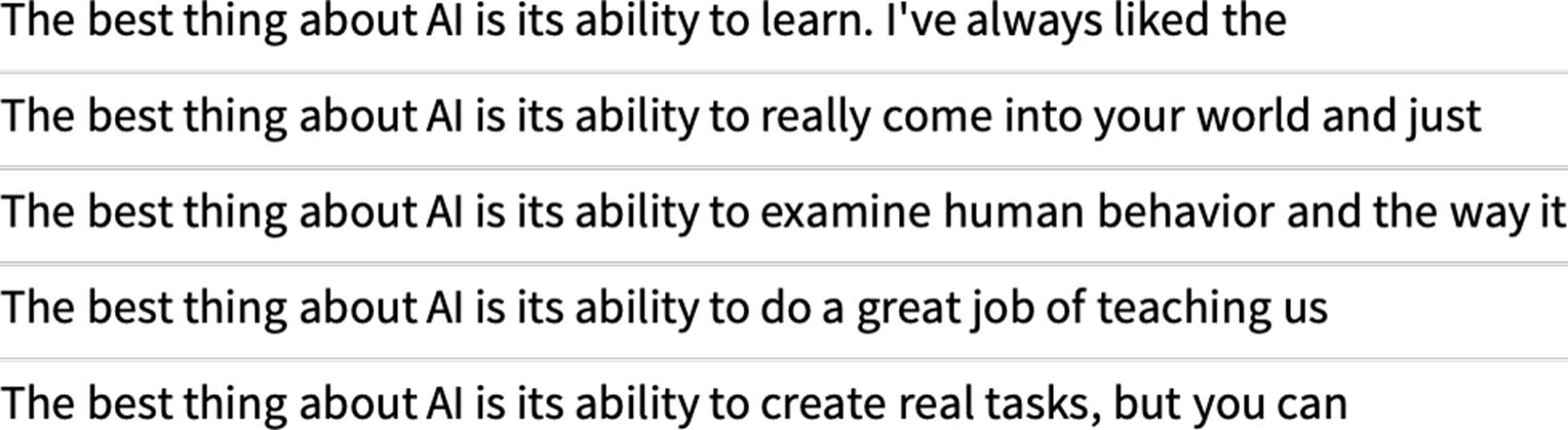 而每次这样做,都会有不同的随机选择,文本也会不同 —— 如这 5 个例子: