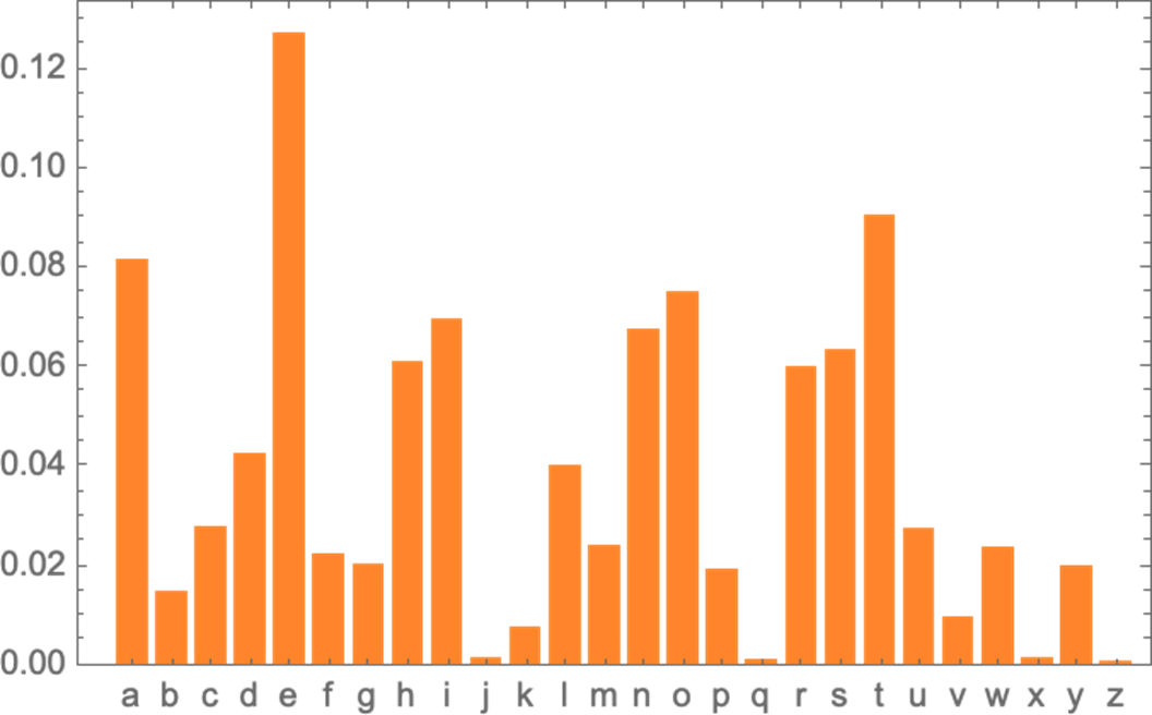 结果相似,但不一样(“o” 在 “dogs” 文章中无疑更常见,因为毕竟它出现在 “dog” 这个词本身)。尽管如此,如果我们采取足够大的英语文本样本,我们可以期待最终得到至少是相当一致的结果。