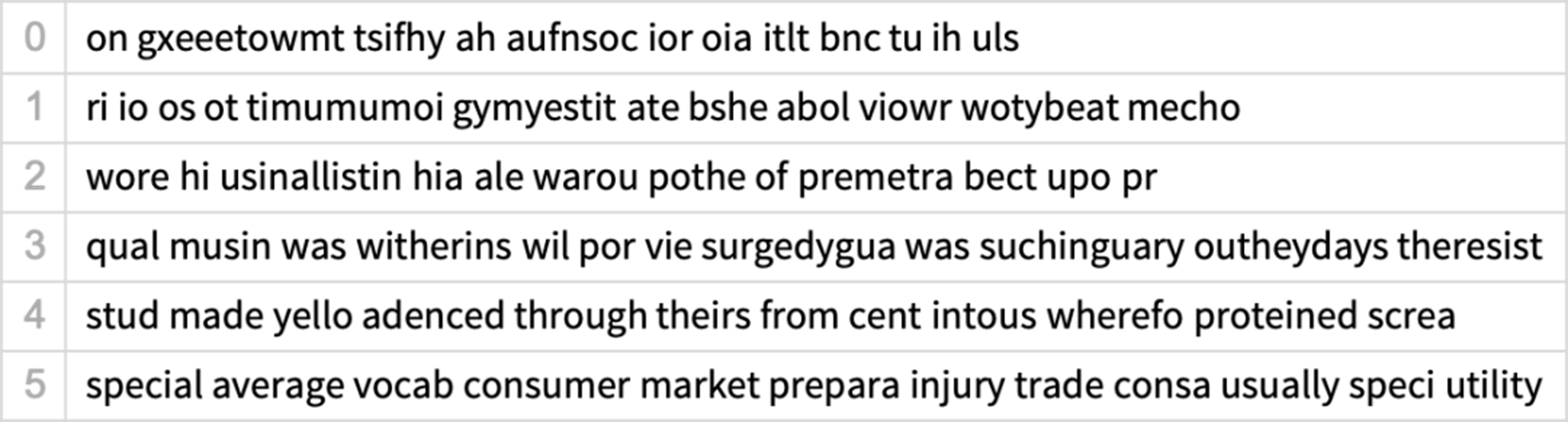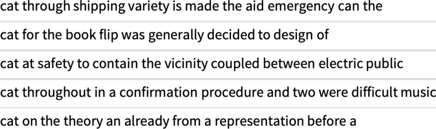 现在出现了一些拼写正确的单词,但结果仍不够理想!理论上,进一步增加n的值,输出结果会得到改善,但在实践中,我们无法显著增加n值,因为这需要一个庞大的数据集来训练模型。最后,我们可以尝试将单词而不是字符作为基本单位(在自然语言处理术语中称为“词元(token)”)。这会改善输出结果,但因为n<6,生成的文本仍然缺乏连贯性。