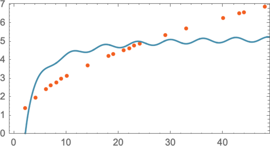 我们怎么知道要在这里尝试使用一条直线呢?在某种程度上我们不知道。这只是数学上简单的东西,而我们已经习惯了这样的事实:我们测量的很多数据都被数学上简单的东西很好地拟合了。我们可以尝试一些数学上更复杂的东西 —— 比如说 a + bx + cx2,然后在这种情况下,我们做得更好: