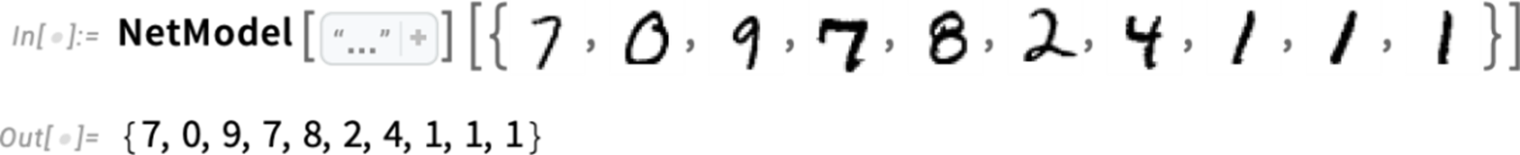 但最终的结果是,如果我们把一幅图像的像素值集合输入这个函数,就会得出一个数字,指定我们的图像是哪个数字。稍后,我们将讨论如何构建这样一个函数,以及神经网络的概念。但现在让我们把这个函数当作黑匣子,我们输入例如手写数字的图像(作为像素值的阵列),然后我们得到这些数字对应的数字:
