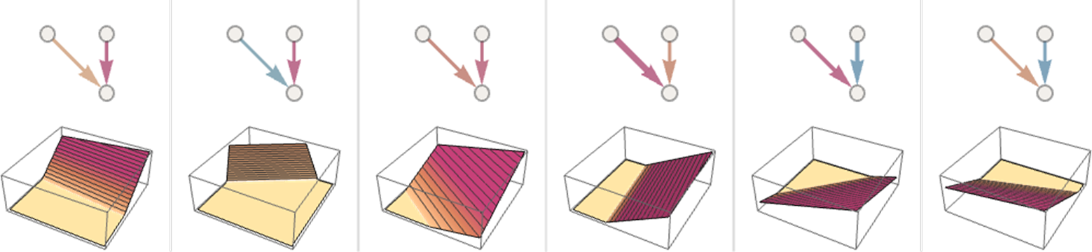 但让我们回到单个神经元上。下面是一个有两个输入(代表坐标 x 和 y)的神经元在选择不同的权重和常数(以及 Ramp 作为激活函数)后可以计算的函数的一些例子: