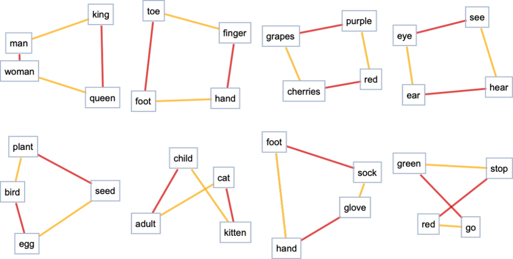 显然,这是一派胡言。那么,我们如何才能做得更好呢?就像对待字母一样,我们可以开始考虑的不仅仅是单个词的概率,还有成对的或更长的词的 n-grams 的概率。在成对的情况下,以下是我们得到的 5 个例子,所有情况都是从 “猫” 这个词开始的: