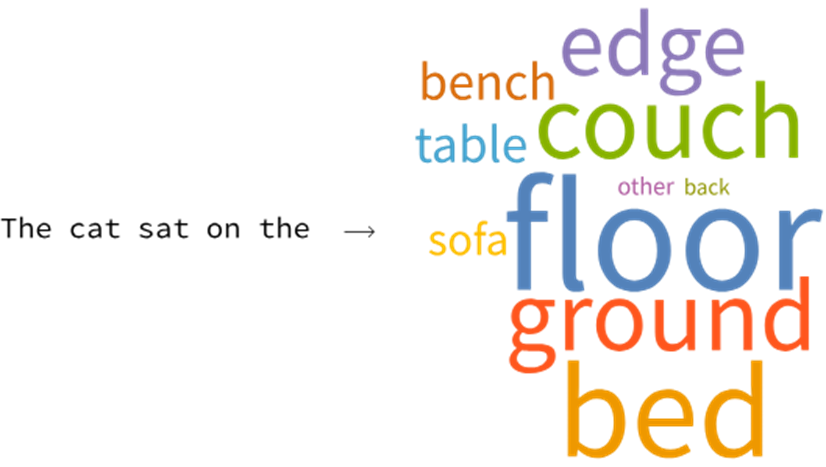 在该案例中,我们想要生成文本。目前,标准的方法是训练一个模型,通过前面的单词预测后面的单词。由于下一个单词有多种可能性,模型会学习为每个可能的单词关联一个概率。以下是对“the cat sat on the”之后可能出现单词的概率分布可视化图像:
