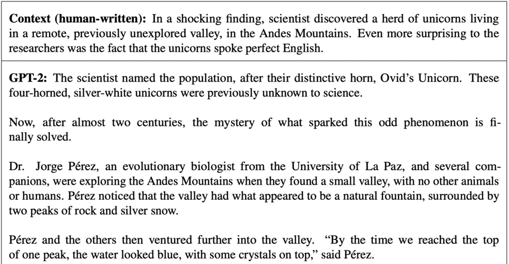 在文本理解类语言模型发展的同时,OpenAI开始基于Transformer创建文本生成类语言模型。首先是2018年的GPT-1,有1亿个参数;然后是2019年的GPT-2,拥有高达15亿个参数,并在40GB的文本上进行了训练。至少对我来说,GPT-2的创建是一个至关重要的时刻。以下是GPT-2可以生成的文本示例,从一个由人类撰写的段落开始: