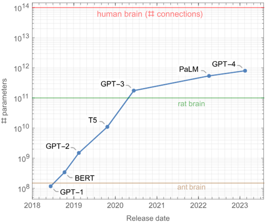 在两年时间里,模型参数的数量增加了1000倍,目前最大的模型(如GPT-4)已接近1万亿个参数,这是因为模型规模的增加与性能的改善密切相关,并且目前还未达到性能瓶颈。这些模型规模十分庞大,与人脑相比,人脑约有1000亿个神经元,每个神经元平均与其他1000个神经元相连接,总共约有100万亿个连接。从某种意义上说,最大的LLM仍然比人脑小100倍。当然,这只是一个非常宽泛的比较,因为人脑和当前LLM使用的架构和学习方法都截然不同。