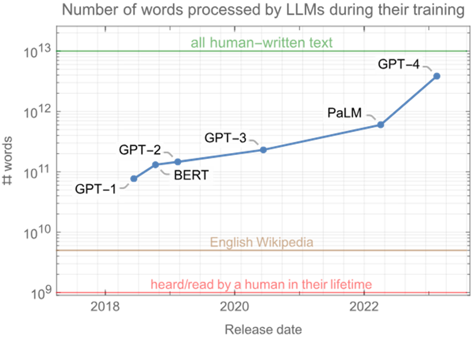 如你所见,数量十分庞大。这些模型在训练过程中会接触超1000亿个单词,是一个人在一生中听到或阅读单词数量的100倍以上!这显示出神经网络与人脑的不同之处:神经网络的学习速度比人类慢得多,但可以获得比人类接触的多得多的数据。
