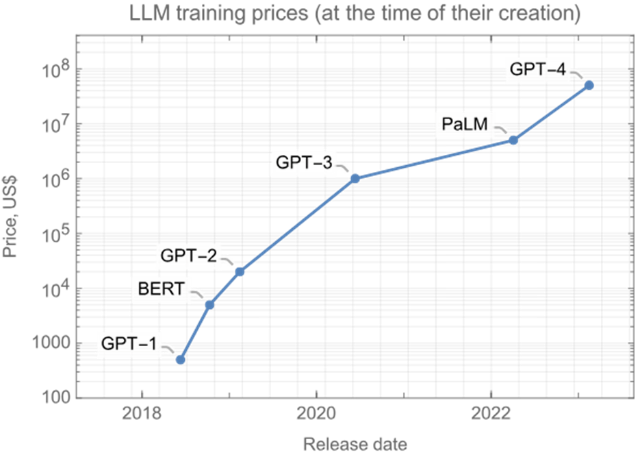 另一个问题是,通过用更多的数据训练更大的模型,计算成本也在增加。以下是训练上述模型的预估计算成本: