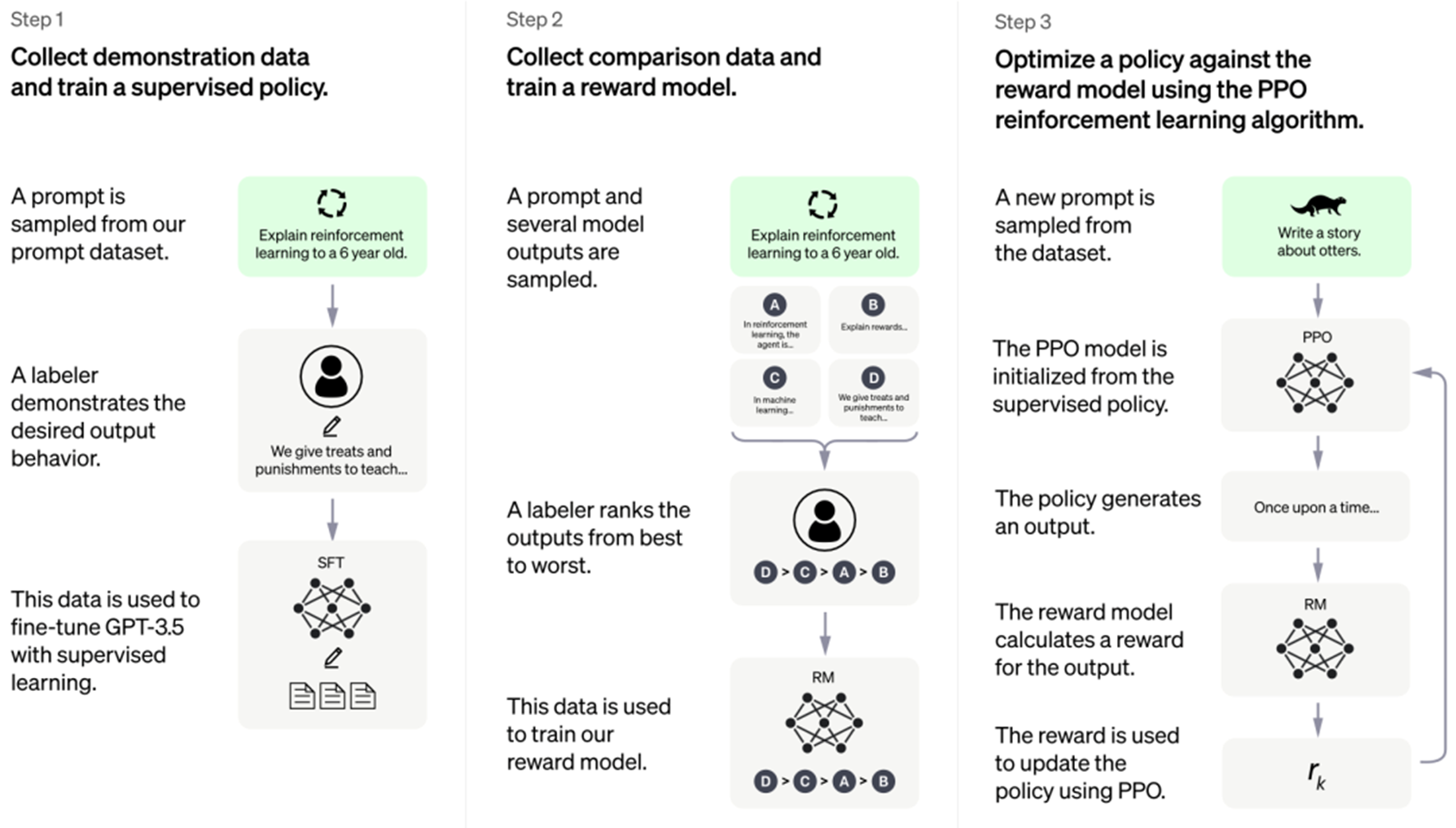InstructGPT和ChatGPT的指令调整步骤。来源:https://openai.com/blog/chatgpt(修改自https://arxiv.org/abs/2203.02155)