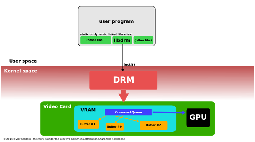 DRM批量缓冲区提交模型:DRM设计的核心是DRM_GEM_EXECBUFFER ioctl,允许用户空间应用程序向内核提交一个批处理缓冲区,然后内核将其放在GPU上。此ioctl允许许多事情,如共享硬件、管理内存和强制执行内存保护。