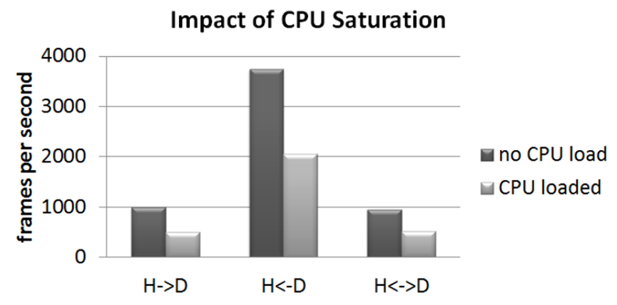 CPU密集工作对GPU密集任务的影响。当系统中存在并行GPU和CPU工作时,当前的操作系统抽象限制了操作系统提供性能隔离的能力。H→D是一个CUDA工作负载,它具有从主机到GPU设备的通信,而H←D具有从GPU到主机的通信,H↔D具有双向通信。