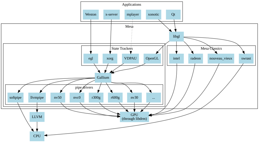 Mesa也称为Mesa3D和Mesa3D图形库,是OpenGL、Vulkan和其他图形API规范的开源软件实现。Mesa将这些规范转换为特定于供应商的图形硬件驱动程序。其最重要的用户是两个图形驱动程序,它们主要由Intel和AMD为各自的硬件开发和资助(AMD在不推荐的AMD Catalyst上推广其Mesa驱动程序Radeon和RadeonSI,Intel只支持Mesa驱动程序)。专有图形驱动程序(如Nvidia GeForce驱动程序和Catalyst)取代了所有Mesa,提供了自己的图形API实现,开发名为Nouveau的Mesa Nvidia驱动程序的开源工作主要由社区开发。