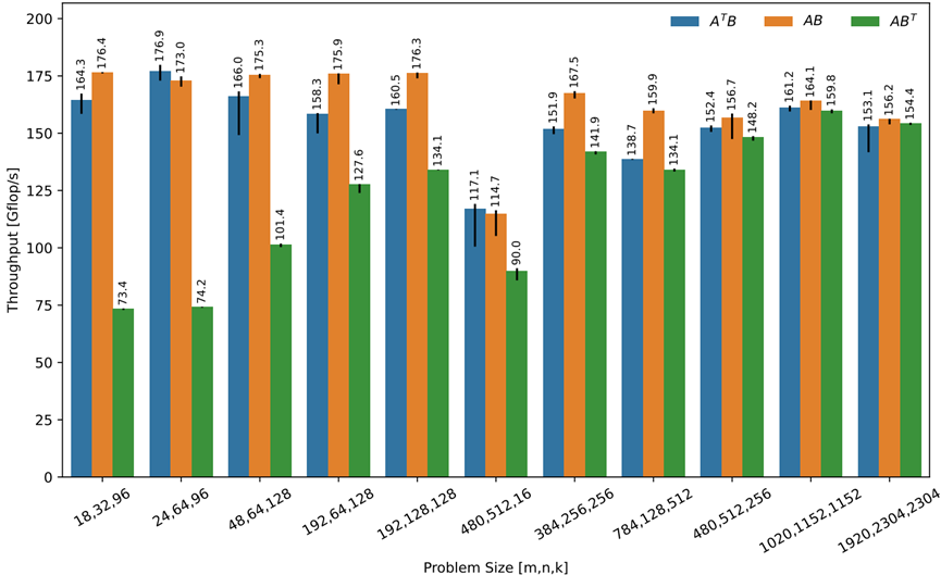 在数值计算中,获得高的矩阵乘法吞吐量是至关重要的。在式(7-1)中,展示了测量纯矩阵乘法与转置变体的性能。