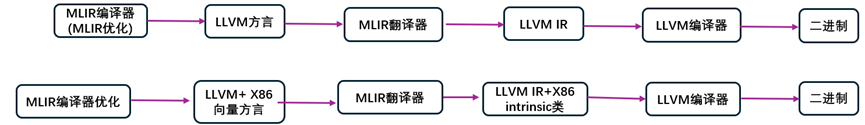图7-2 MLIR编译器流的简单可视化描述:(顶部)仅限LLVM方言,(底部)LLVM与x86向量方言,后者包含特定硬件的内在操作。