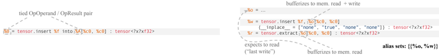这种抽象级对不可变的SSA值进行操作:从现有的张量值创建新的张量值。在随后的下译步骤中,内存位置仅作为函数边界处的注释出现,以指定这些张量将如何具体化到内存中。