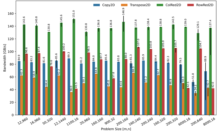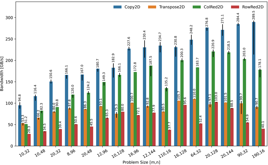 Transpose2D在移动时重新排列数据。这会导致比Copy2D的简单1加载1存储模式更复杂的指令序列。实现了Copy2D的30-60%的带宽与高达109 GB/s的L1带宽,以获得最有利的大小。