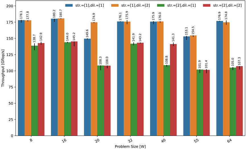 由于这是一个具有多个参数的严格计算约束的内核,只关注向量化内核对于L1中的小尺寸的性能。得益于模块化与可组合方法,可以按照之前讨论的填充、包装与剥离策略,从较小的尺寸构建较大的尺寸。编译器实现了单个一维向量化策略,该策略表现出足够的算术强度,并在二维情况下重复使用。二维策略只需将𝐻与