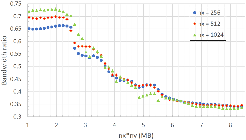 无论nx的大小如何,当单个xy平面在内存中超过约2.5 MB时,性能都会下降。事实证明,2.5 MB足够小,可以在8 MB的L2缓存中容纳三个连续的xy平面,这解释了为什么FOM的值更高。然而,步幅越大,缓存中的元素就越多,从而降低了L2CacheHit率,进而降低了FOM。nx*ny超过8 MB后性能水平下降,因为此时只有一个平面适合(或部分适合)缓存——这就是FETCH_SIZE比理论估计值大三倍的地方。