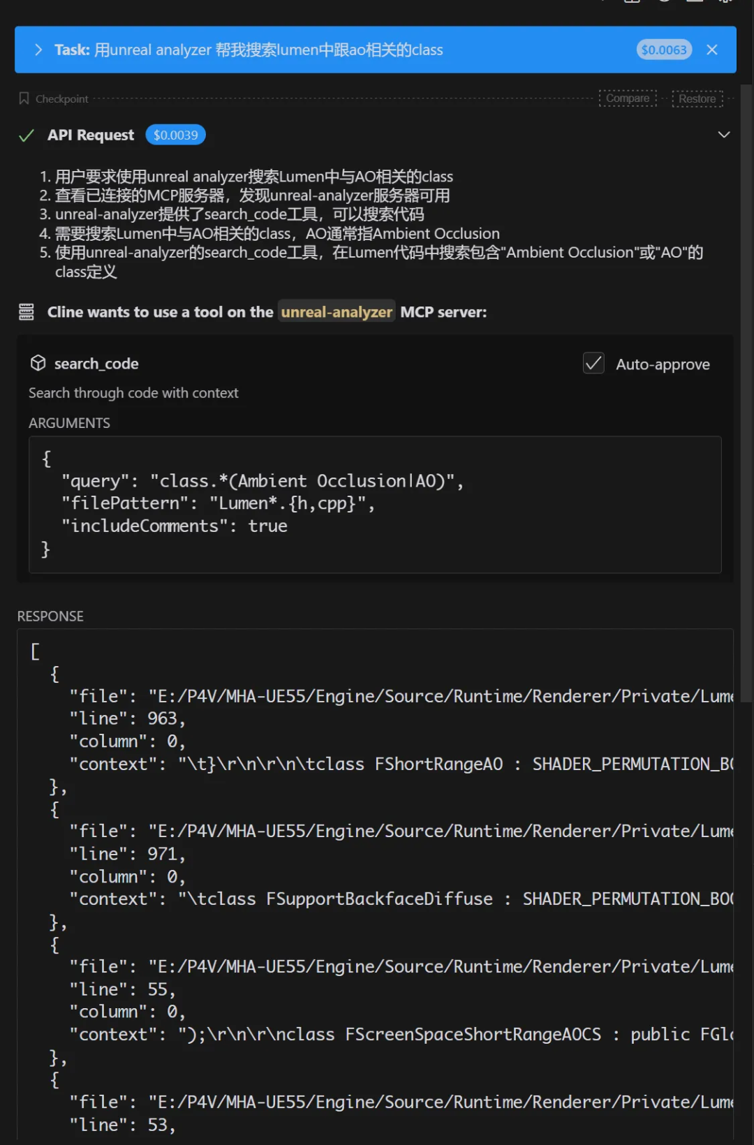 添加图片注释,不超过 140 字(可选)接下来,我们就可以用自然语言的方式快速分析UE代码了,我们在Cline的对话框中切换到Act Mode(只有Actmode可以调用MCP Server),然后按照我们日常和同事交流说话的口吻打字:先告诉他我们的UE代码在哪里: