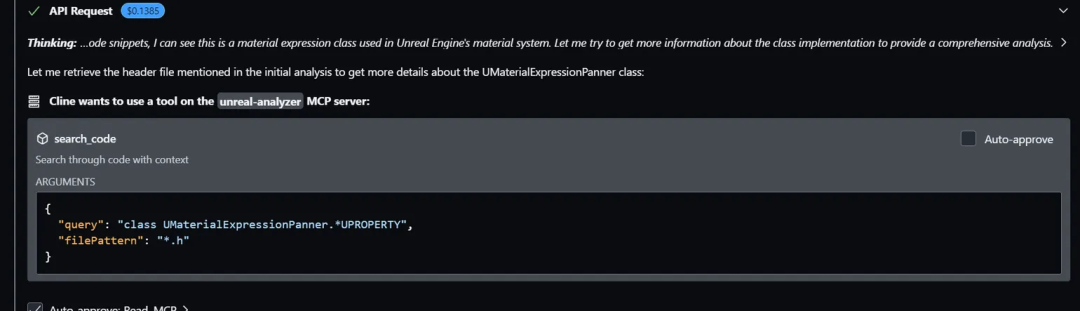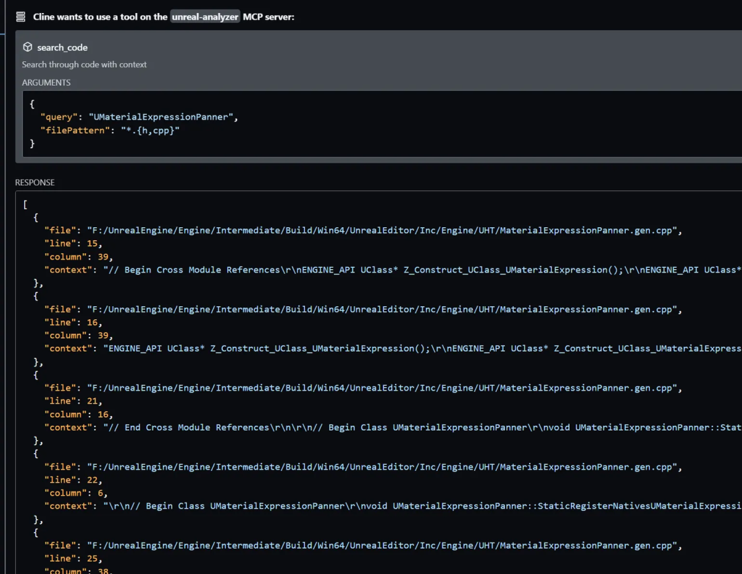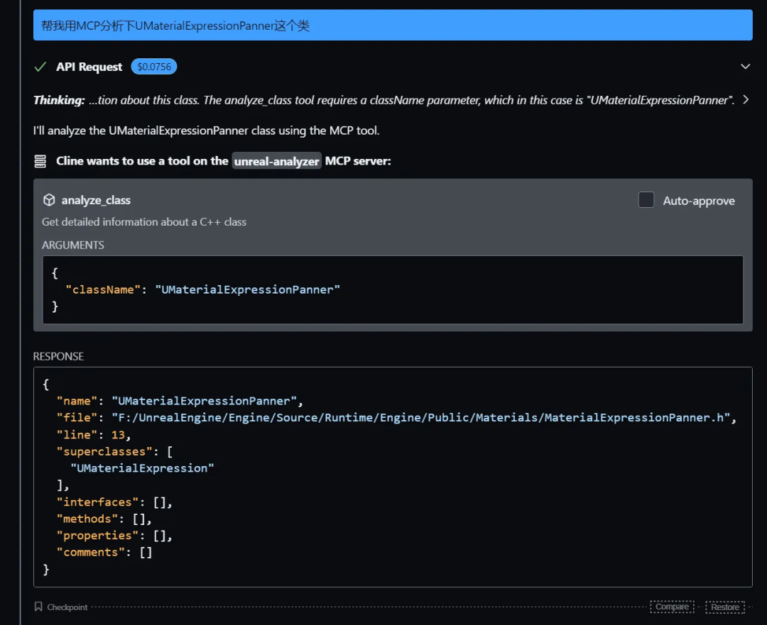添加图片注释,不超过 140 字(可选)直接说:我想分析下UMaterialExpressionPanner这个类,LLM会分析你的需求,自己去调用工具: