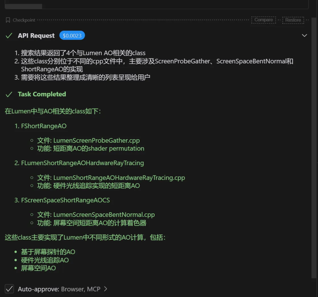 添加图片注释,不超过 140 字(可选)来个稍微复杂点的任务,让它帮我找找lumen里AO相关的类:
