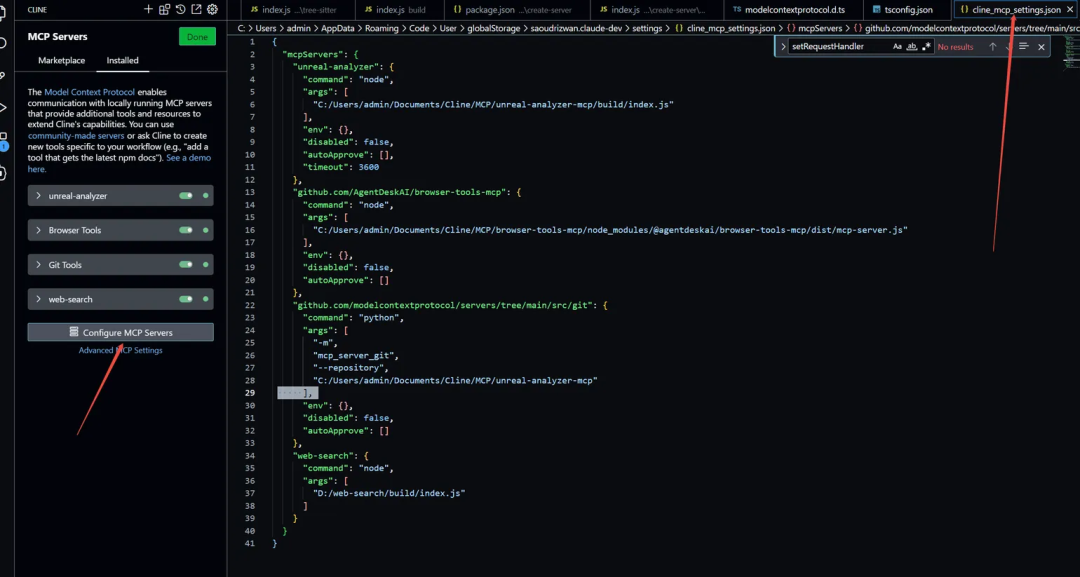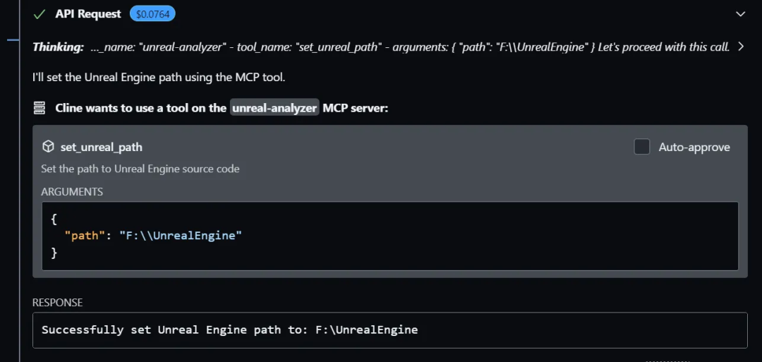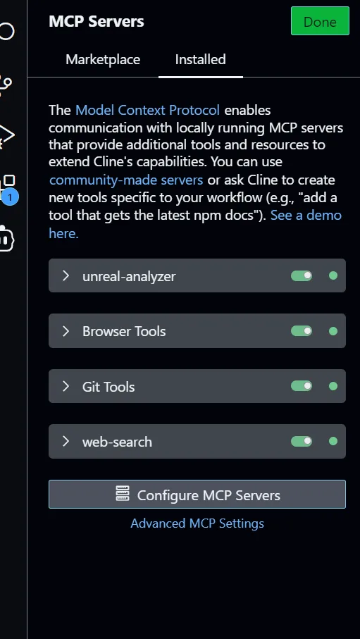添加图片注释,不超过 140 字(可选)前文提到过,MCP支持多种语言开发,包括Python,Typescript等,因此可以看到我们的MCP配置中也支持多种入口,一个MCP Server的入口,可以是Python脚本,可以是bat批处理,也可以是nodejs程序的入口,对于我们的server来说,我们要配置的是一个nodejs的入口程序,如下面的代码:"unreal-analyzer": { "command": "node", "args": [ "C:/Users/admin/Documents/Cline/MCP/unreal-analyzer-mcp/build/index.js" ], "env": {}, "disabled": false, "autoApprove": [], "timeout": 3600 }我们将入口指向我们编译好的JavaScript文件,保存好之后,Cline就会自动去执行这个index.js,如果有运行错误,那么Cline的设置窗口中会报错,当出现下面的绿色按钮时,则证明我们的MCP Server连接成功了: