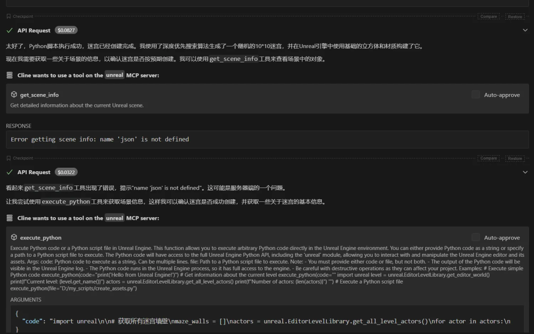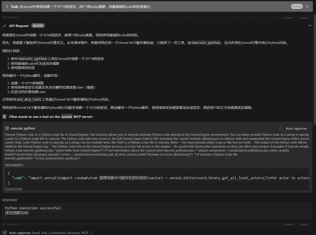 添加图片注释,不超过 140 字(可选)通过这个很简单的例子工程,我们可以总结出MCP的特点,MCP通过工程化的方法和统一的协议,给LLM装上了使用工具的手,这样我们的AI就可以真正的替我们干活。真正的UnrealMCP实现理解了MCP的工作逻辑和原理之后, 再开发垂直领域的MCP工具就会相对简单。接下来我们来分析下真正的能干活的UnrealMCP(github.com/kvick-gam...)是怎么工作的。同时也展示下Python SDK下的MCP工作流。UnrealMCP由两部分组成,一部分是MCP Server的Python代码,一部分是UE5的插件,其中UE5的插件主要负责对接我们操作UE需要的一些C++逻辑。这部分的安装逻辑和通常的UE插件完全一样。而MCP本身的部分,我们希望能够在Cline插件中调用,由于这个UnrealMCP只能在Claude中工作,而Claude在国内使用非常麻烦,因此在Cline中配置本MCP时,我们需要对仓库上说明的配置文件稍微进行些修改。 在运行安装python, 启动venv等工作之后,我们在配置Cline MCP的json时,需要按照如下代码配置:"unreal": { "command": "cmd.exe", "args": [ "/c", "F:\\UnrealEngine\\Engine\\Plugins\\UnrealMCP\\MCP\\run_unreal_mcp.bat" ], "env": { "PYTHONPATH": "F:\\UnrealEngine\\Engine\\Plugins\\UnrealMCP\\MCP\\python_modules", "PATH": "${PATH};F:\\UnrealEngine\\Engine\\Plugins\\UnrealMCP\\MCP\\python_env\\Scripts" }, "disabled": false, "autoApprove": [], "cwd": "F:\\UnrealEngine\\Engine\\Plugins\\UnrealMCP\\MCP" },这样就可以在Cline中使用UnrealMCP了。使用上,UnrealMCP也是非常简单的,打开UE,启动UnrealMCP插件之后,我们告诉LLM我们的需求:在场景中创建一个迷宫关卡: