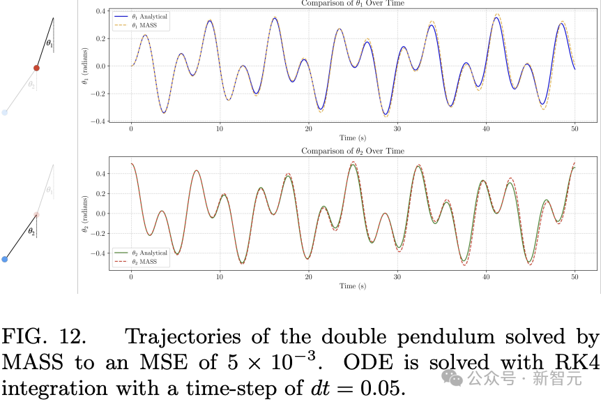 研究团队成功复现了双摆系统的解析轨迹(图12)。
