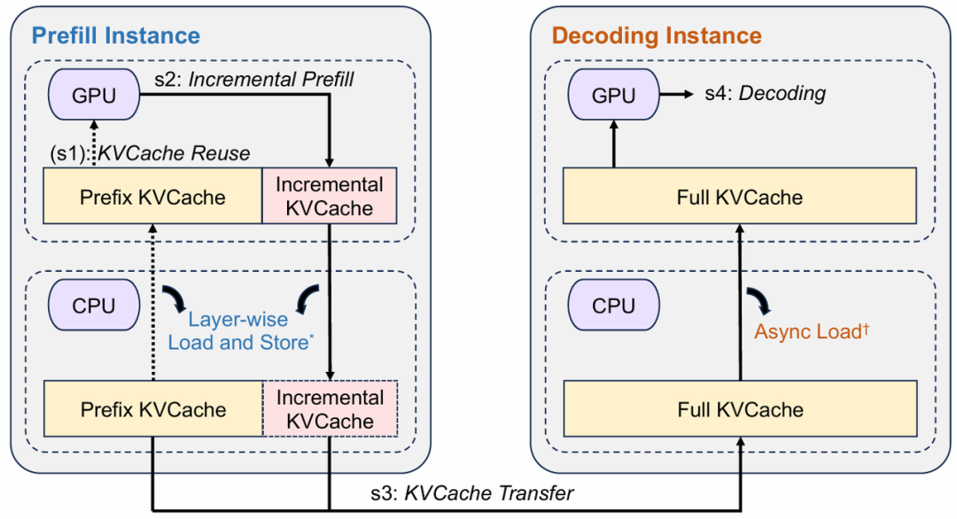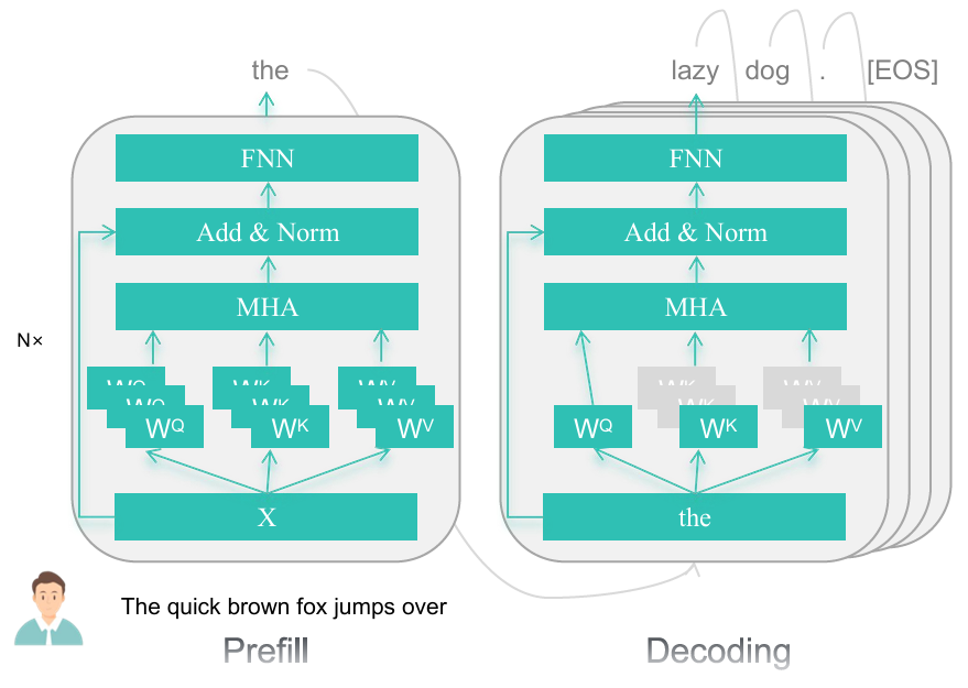 预填充阶段模型处理整个输入, 计算束缚的前向计算, 生成第一个词元 token, 缓存 K 和 V (KV cache) 避免 重计算。解码阶段, 使用 KV cache 连续生成 词元 tokens, 随着内存使用的增加, 减少了计算耗时。每个新词元 token 输入模型后, 就会计算 Q, K, V, 确保高效生成, 生成 [EOS]时结束。