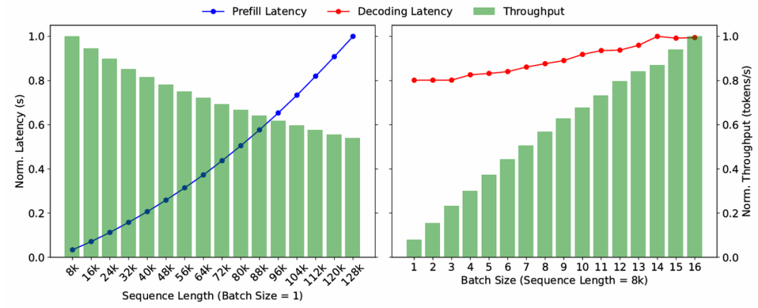 以Llama2-70B dummy 模型为例。prefill 阶段在 batch=1时, 时延随着sequence length 增长, 呈线性增长。decode 阶段 sequence length 和 batch size 对比如下图。