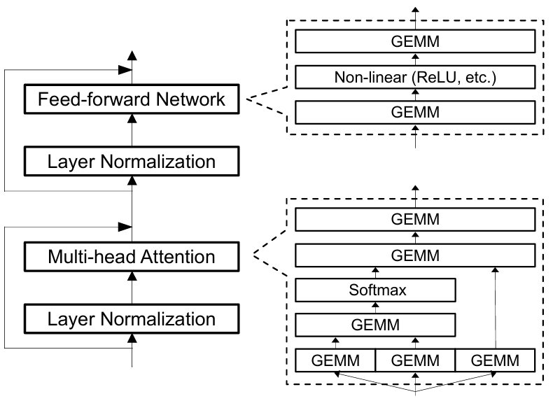 Transformer 架构大模型由多层网络层组成, MHA 多头自注意力模块, FFN 前馈网络模块, LayerNorm 层归一化模块。用户输入文本, 使用 tokenizer 转换成词元 token, 加入位置信息, 通过可训练的权重矩阵 WQ, WK, WV 计算出 对应的 query (Q), key (K), value (V) 向量, 作为 后续 MHA 多头自注意力模块的输入。多头注意力模块的多头分别单独并行计算, 把计算结果连接起来; 再和 WO 权重矩阵计算得到注意力模块的输出结果。前馈网络层 FFN 使用两个线性转换进行计算。
