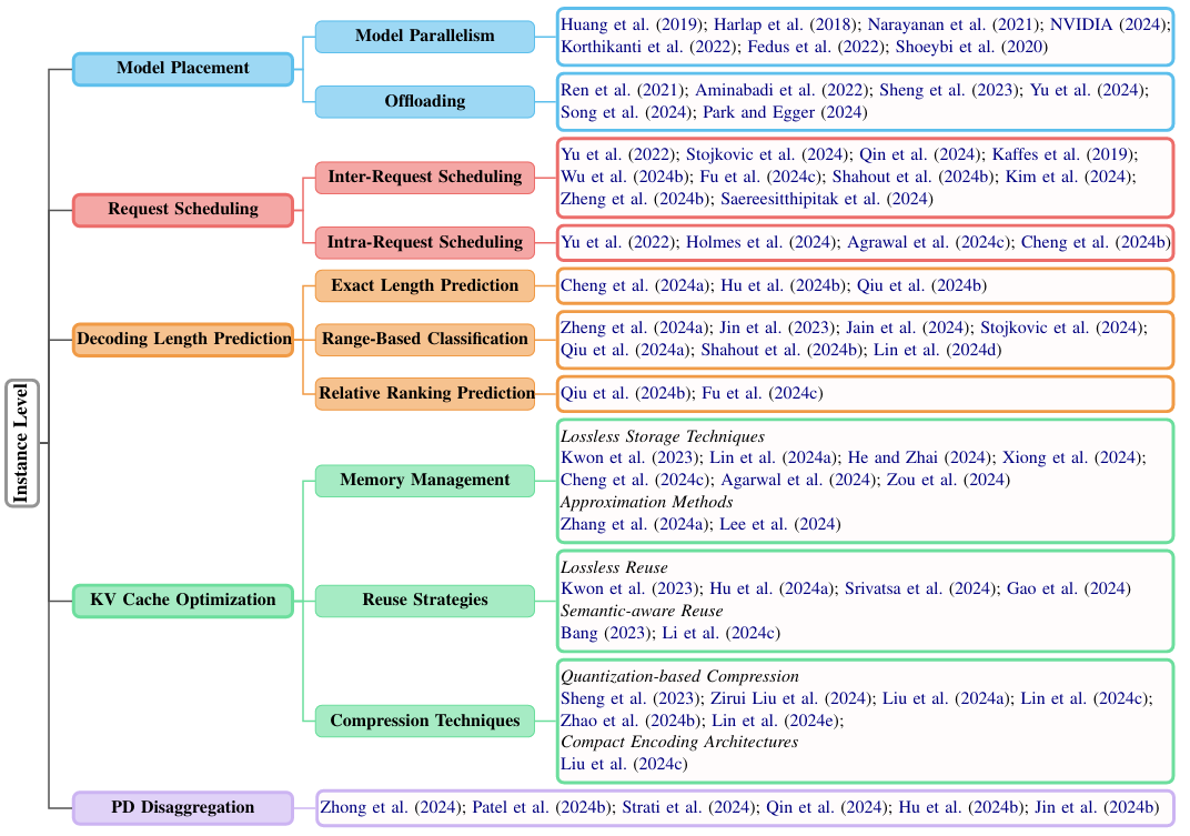 实例级别, 包括模型推理, 请求调度, 解码长度预测, 存储管理, PD分离方案。
