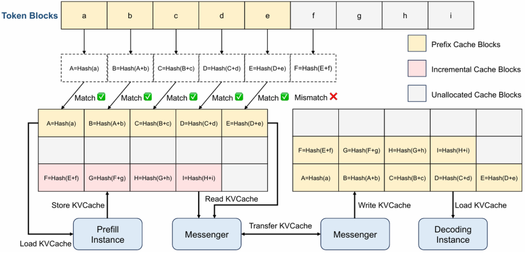 图中演示了CPU 内存中的 KVCache pool。每个 block 都带有一个 hash 值由自己的 hash 和 prefix 决定,用于去重。上图演示了 KVCache blocks 的存储和传输 逻辑。CPU 内存中 KVCache 存储为 paged blocks。